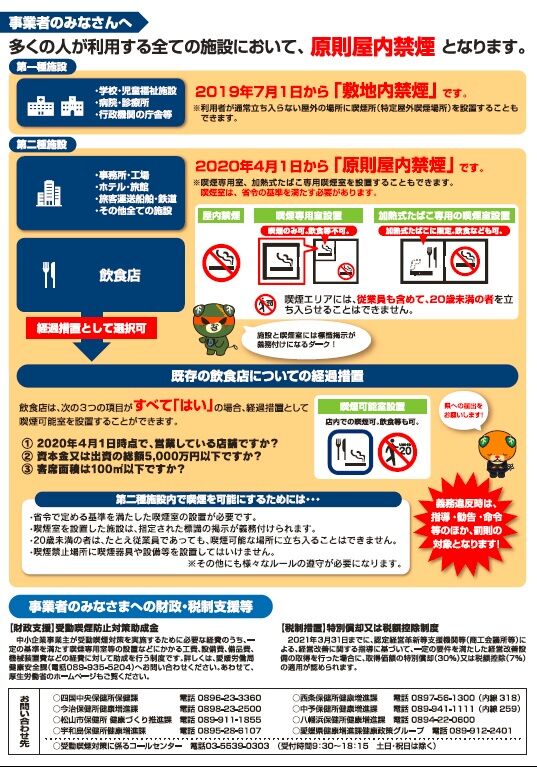 健康増進法の一部を改正する法律の施行により、自宅やホテルの個室などの適用除外場所以外のすべての建物内での喫煙が原則禁煙。条件を満たした換気設備のある喫煙室でのみ喫煙が可能となる。