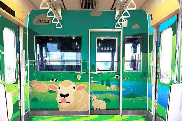 「ひつじでんしゃ」は、こどもの国牧場の羊をイメージしたラッピング電車。こどもの国に併設されている雪印こどもの国牧場では、約30頭の羊や、約40頭の牛などの動物が飼育されており、