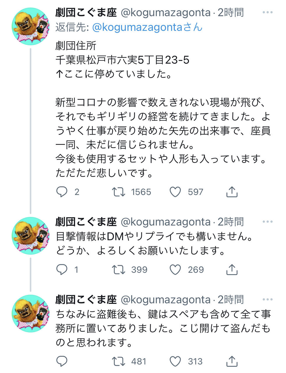 千葉県松戸市にある人形劇団で9日、着ぐるみなど公演道具が入ったトラックが盗まれました。