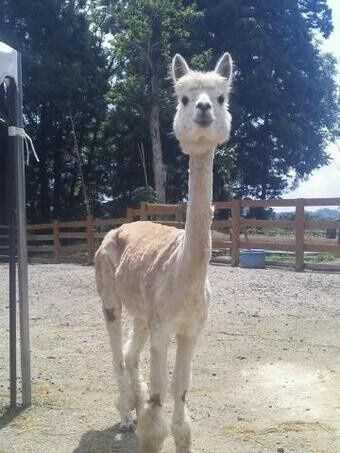 毛を刈って涼しげになったアルパカの「つきみ」=米子市岡成、大山トム・ソーヤ牧場