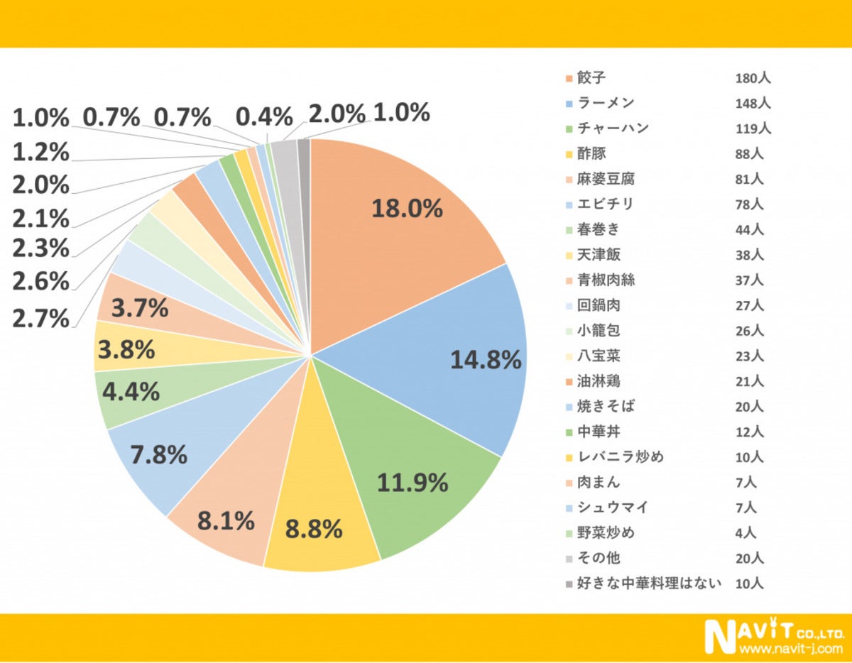 最も好きな中華料理については「餃子」が最多の18.0%。次いで「ラーメン」が14.8%、「チャーハン」が11.9%で続いたが、全体的に票が割れる結果に。