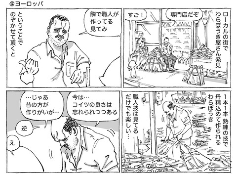 | 海外のホウキ職人紳士が言い放った掃除機への思いが赤裸々すぎた。 …街ブラ中の出来事です…異国の風情もたっぷりな わらぼうき店では 職人紳士が魂込めて ホウキを作っていて アツい言葉と共に出たのは… 貯めた金でルンバ… (出典:) |