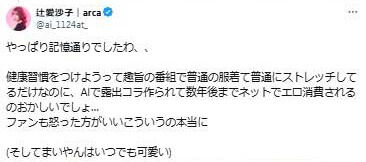 その後の投稿では「やっぱり記憶通りでしたわ、、」と、実際の番組画像が掲載された記事を引用。「健康習慣をつけようって趣旨の番組で普通の服着て普通にストレッチしてるだけなのに、AIで露出コラ作られて数年後までネットで*消費されるのおかしいでしょ…ファンも怒った方がいいこういうの本当に」と訴え、「そしてまいやんはいつでも可愛い」と付け足した。