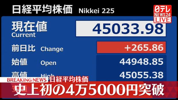 @kazuyadesse【速報】日経平均株価 史上初の4万5000円突破(TBS NEWS DIG Powered by JNN) #Yahooニュース approach.yahoo.co.jp/r/QUyHCH?src=h…
