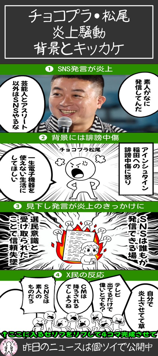 @8gasyuin8そんなやんややんや言うことか? 騒ぎ過ぎじゃない? チョコプラ・松尾の「失言」はなぜSNSユーザーの導火線に火をつけた? 信頼回復のために必要なこと #エキスパートトピ(田辺ユウキ) news.yahoo.co.jp/expert/article…