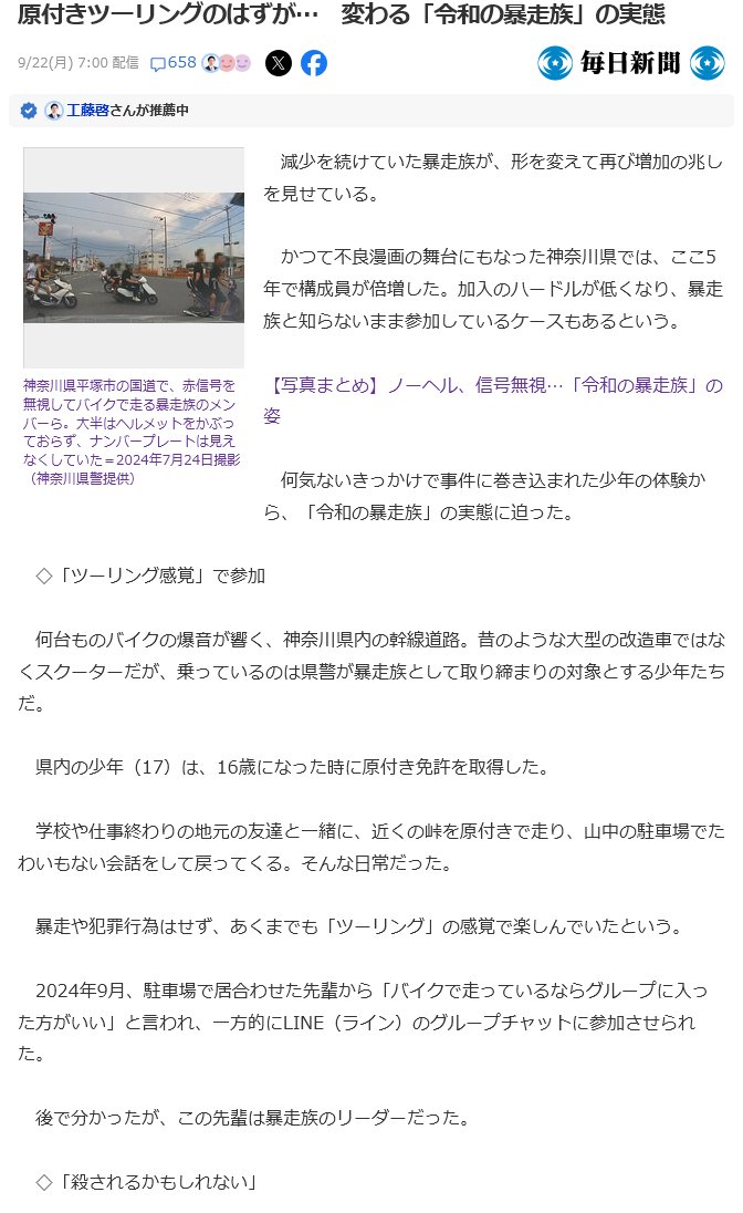 | 原付きツーリングのはずが… 変わる「令和の暴走族」の実態 減少を続けていた暴走族が、形を変えて再び増加の兆しを見せている。 かつて不良漫画の舞台にもなった神奈川県では、ここ5年で構成員が倍増した。加入の… (出典:毎日新聞) |
