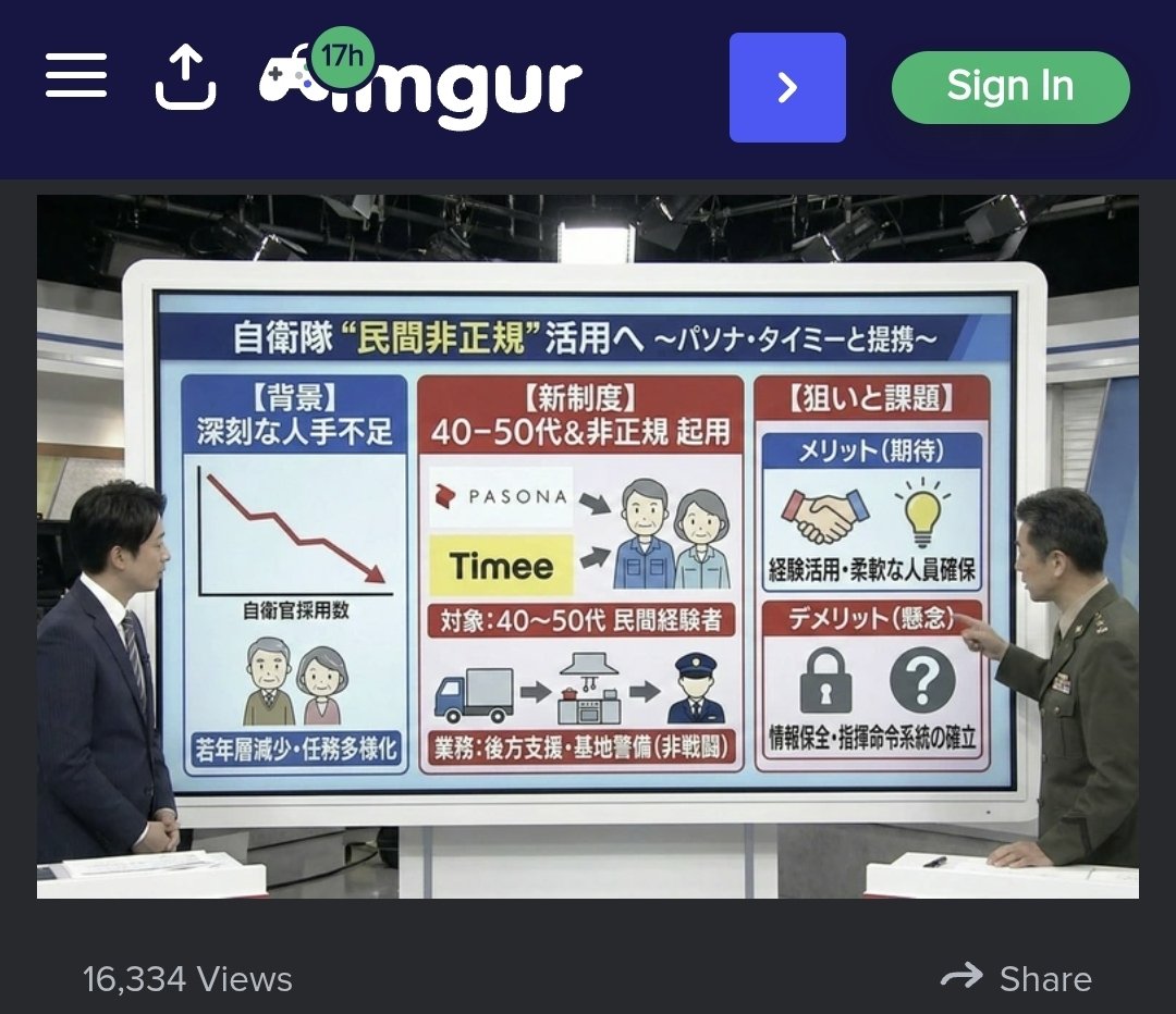 2月13日ごろから「自衛隊がパソナ・タイミーと提携する」というニュース映像を模した偽画像が拡散しています。デマの発生源は5ちゃんねる掲示板のスレッドに貼られた画像共有サイトImgurにUPされた出所不明の画像であり、複数の転載サイトが転載を行い各SNSで拡散されて広まっています。