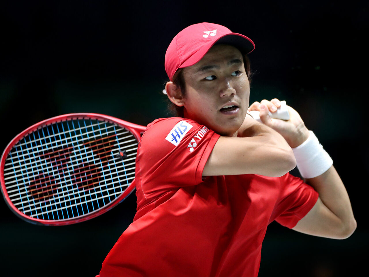 MADRID, SPAIN - NOVEMBER 20: Yoshihito Nishioka of Japan plays a forehand shot during his Davis Cup group stage match against Novak Djokovic of Serbia during Day Three of the 2019 Davis Cup at La Caja Magica on November 20, 2019 in Madrid, Spain. (Photo by Alex Pantling/Getty Images)