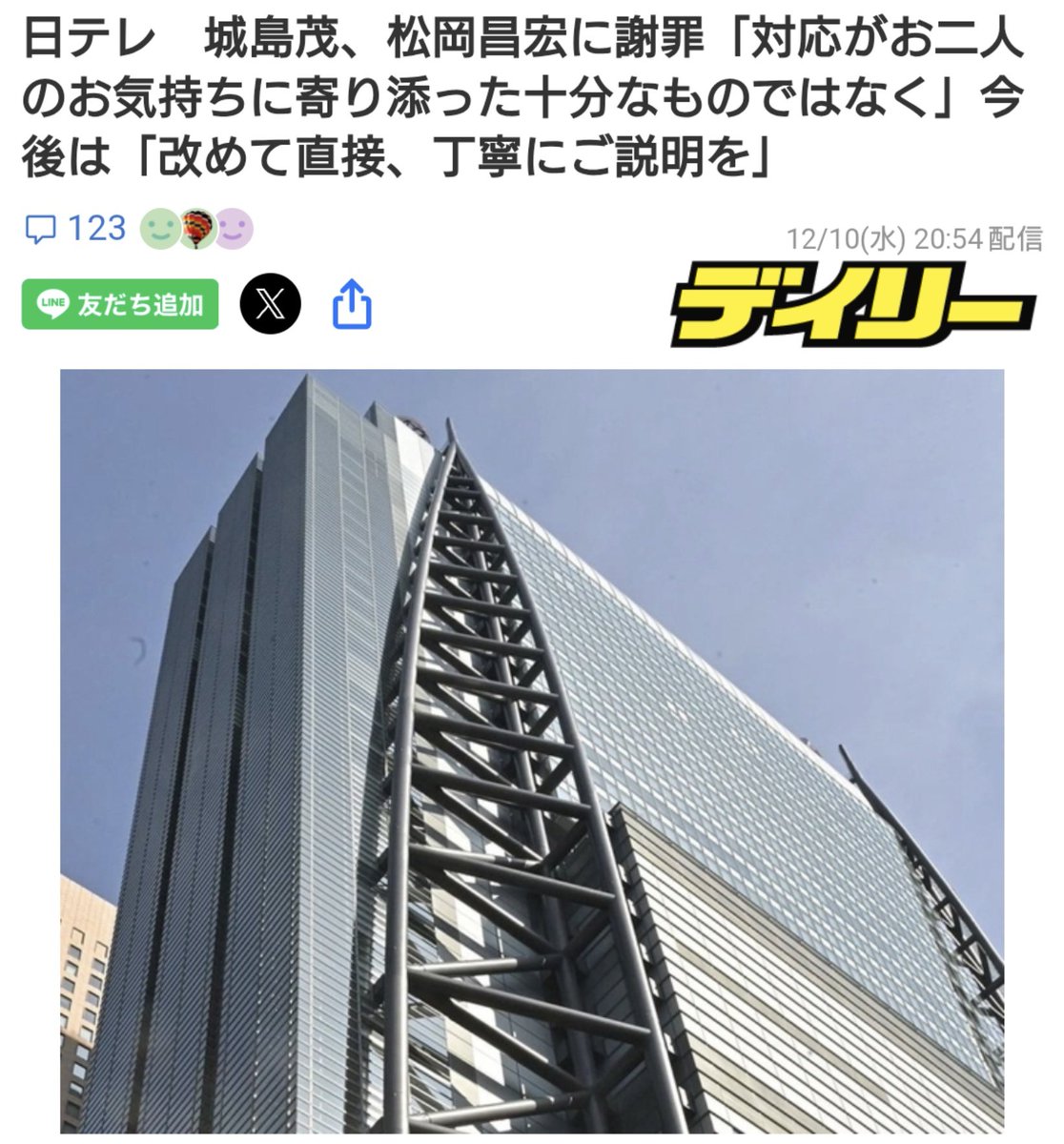 10日、日本テレビが元TOKIOの城島茂(55)と松岡昌宏(48)に対して謝罪の意を表明した。